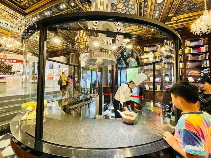 玻璃裡外二樣情,裡面的師傅正專注地製作巧克力,而外面的孩子則是心中有所期待,帶著好奇心欣賞巧克力師傅的大作。
