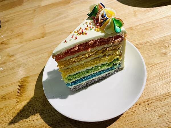最後來份甜點是個像彩虹般的蛋糕,超級可愛的!雖然吃不出什麼口味,但是就是甜甜的大家分著吃,看了也開心,一個人吃完的話可能會膩了點,一起吃就是個好拍又好吃的感覺!