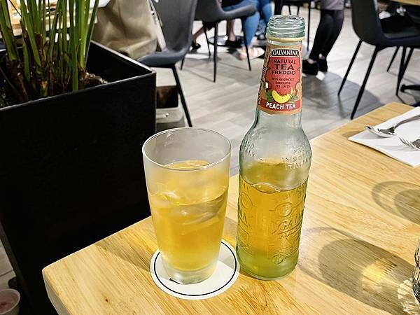 菜單都是單點的,主餐大多就是義大利麵,也有一些其他的配菜和甜點,讓人驚訝的是光是酒單就有長長的一整頁,應該算是義式餐酒館了吧!不過因為我們當天不喝酒,點了個茶也是像酒瓶的樣子,真是可愛。