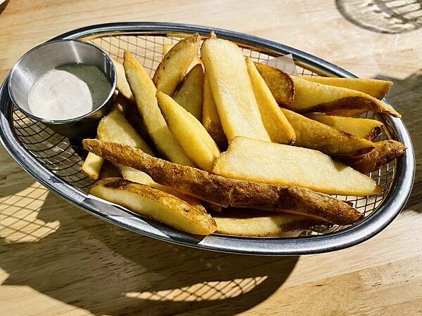 薯條是帶皮長條有點塊狀的,本身有點鹹味還附了沾醬,味道還不錯。