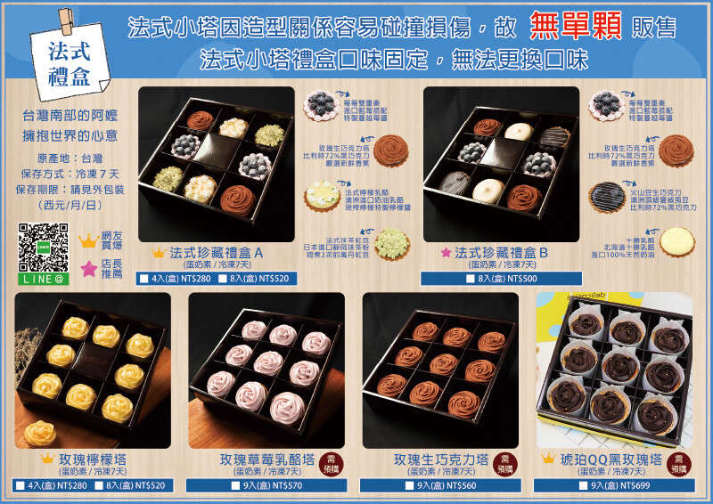 販售品項有手作蛋糕、法式禮盒、經典小塔、常溫伴手禮。