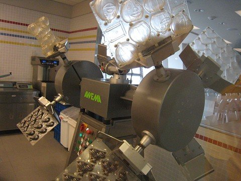 這台大型機器可讓巧克力漿在模具裡徹底均勻翻攪。