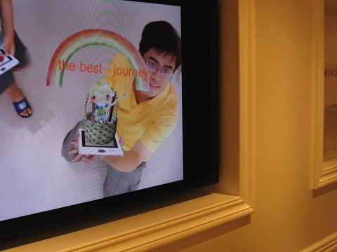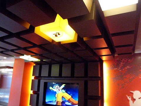 天花板以大型巧克力模型裝飾,而螢幕上放映的是早期77乳加巧克力的廣告,充滿復古的味道。