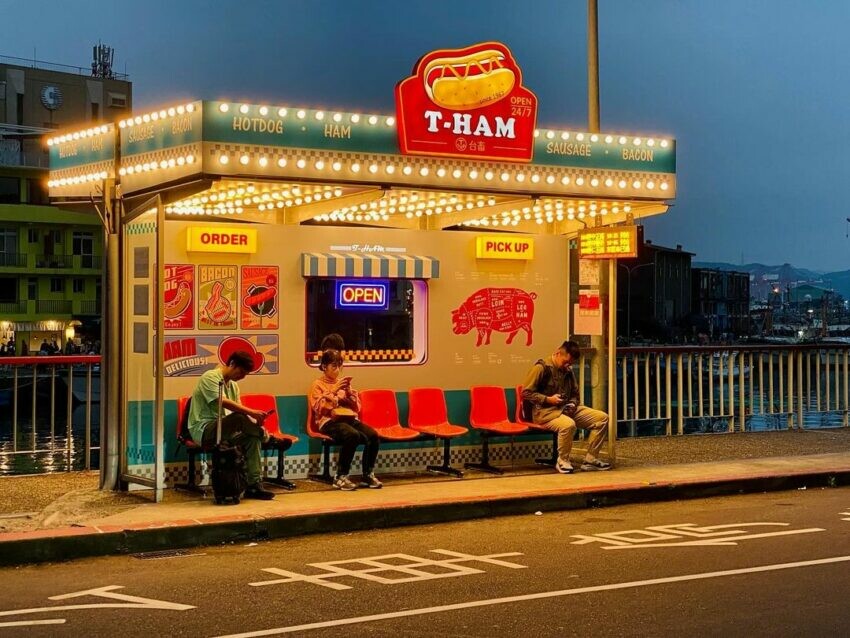 正濱藍與黃昏橘相間的「熱狗堡公車站」就位在正濱漁港彩色屋對面,近期成為基隆超可愛網美打卡景點,讓坐著等公車都變成一件舒適的事。夜晚還有另外打光,白天或晚上拍照都好看,是正濱漁港的新亮點。