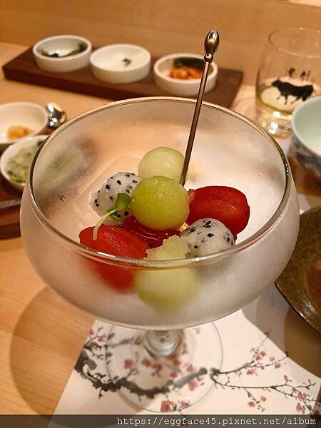 服務員特別拿了一杯冰涼的梅漬番茄和水果讓我們轉換味覺,