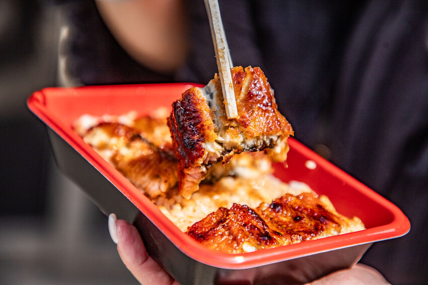 據當地人表示,魚豐的炭烤鰻魚飯最好吃的狀態是剛烤好拿到手五分鐘內吃最好吃,一打開盒子就可以聞到炭烤鰻魚的香氣,帶有甜甜鹹鹹的醬汁風味,晶瑩剔透的國產米飯還浸潤了甜香的鰻魚醬汁