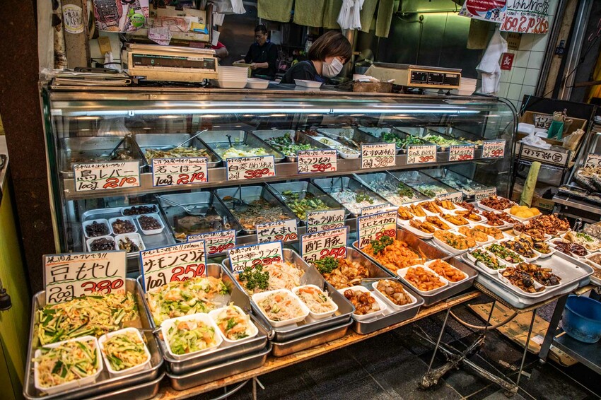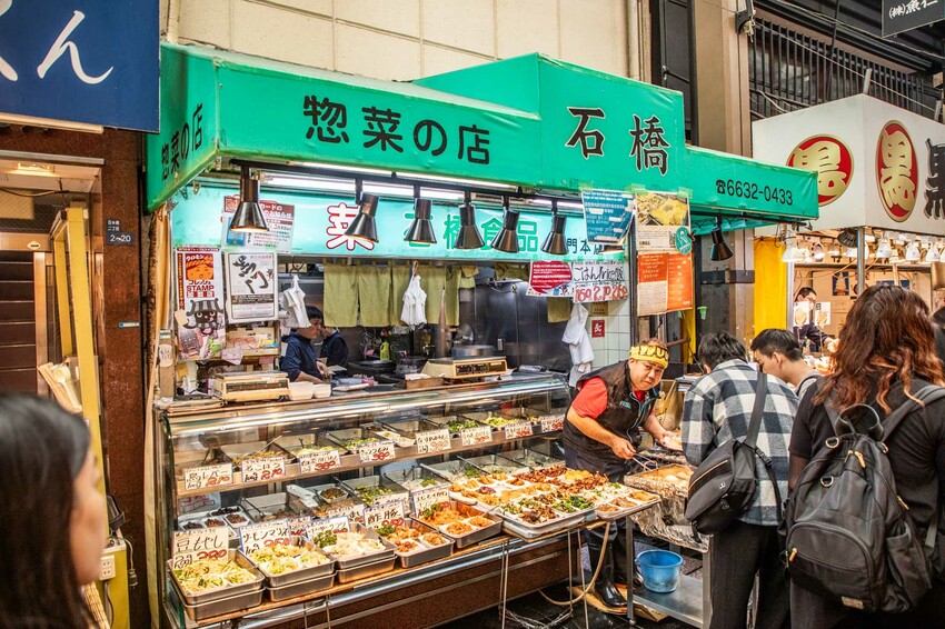 石橋食品在黑門市場已經有近50年歷史了,他們家的關東煮可以說是赫赫有名,就算夏天大熱天也是很多人排隊購買,石橋食品除了關東煮外,其實他們的本業是賣各式熟食小菜(惣菜),所以店門口有很多小菜成列,而且價格也不貴