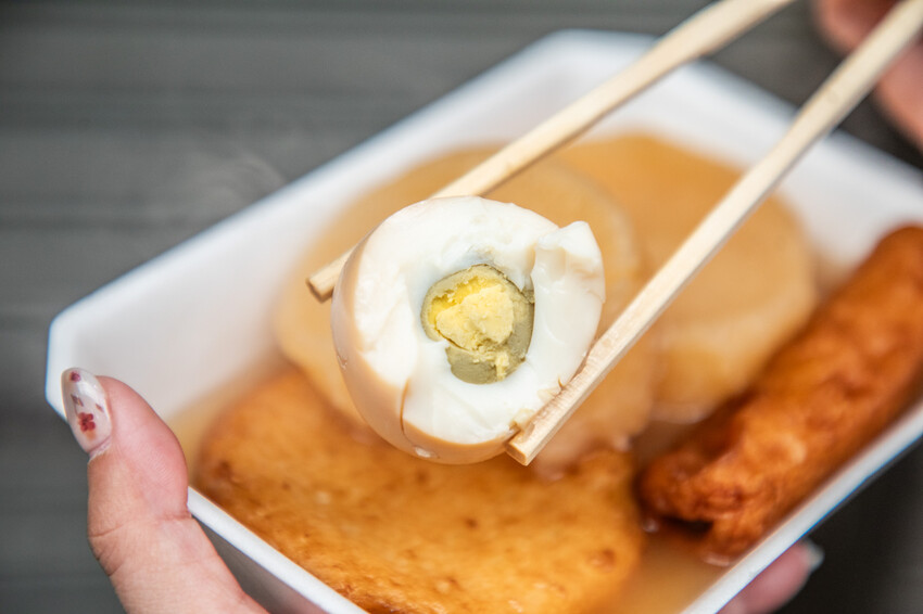 玉子(滷蛋),直接跳過吧,外表看起來很好吃,裡面完全沒入味,就是水煮蛋,好在可以沾關東煮湯汁一起吃