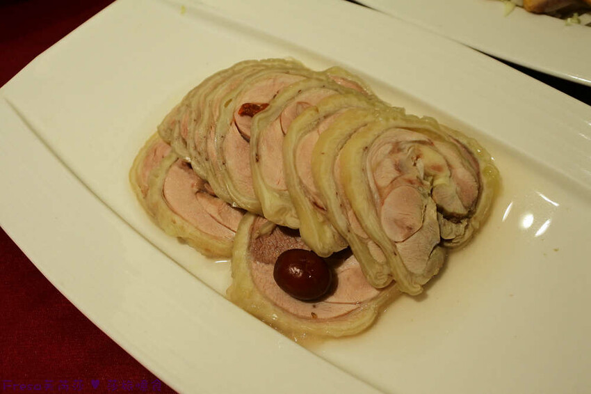 整塊烤鴨帶有肉汁濕潤,鴨肉厚實有嚼香.