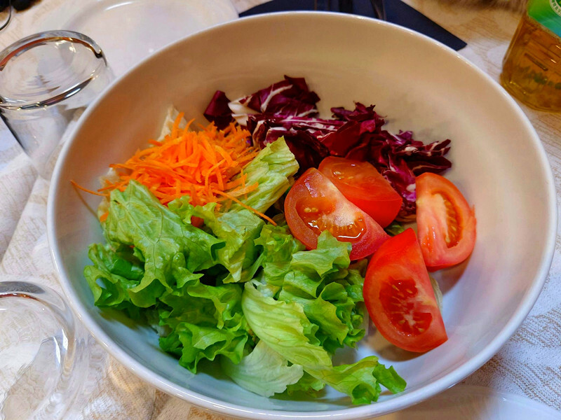 第一道先上生菜沙拉,五顏六色的生菜包括萵苣,番茄,紅蘿蔔和紫高麗菜絲,跟美國不太一樣,在義大利的沙拉幾乎都是加橄欖油和紅醋