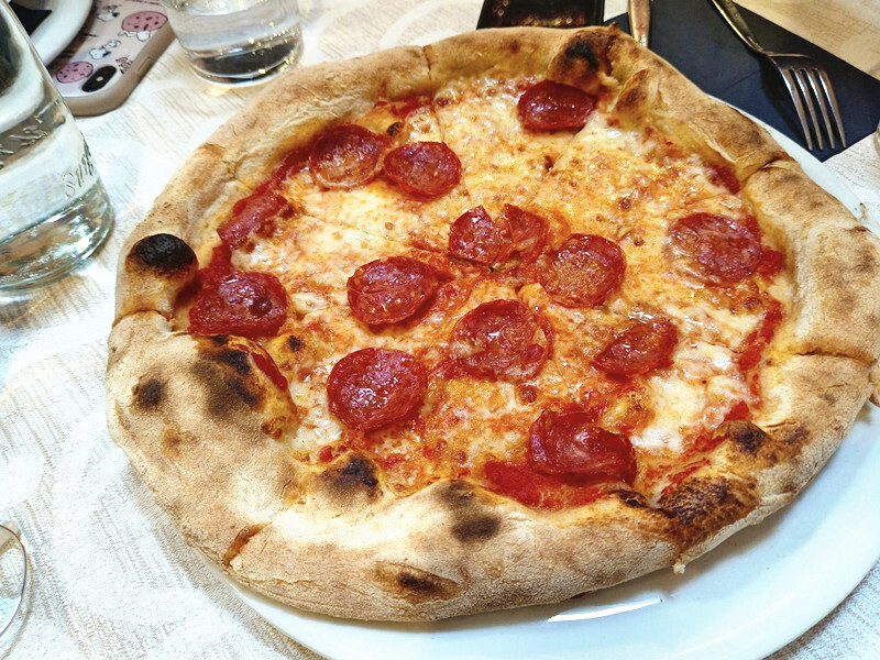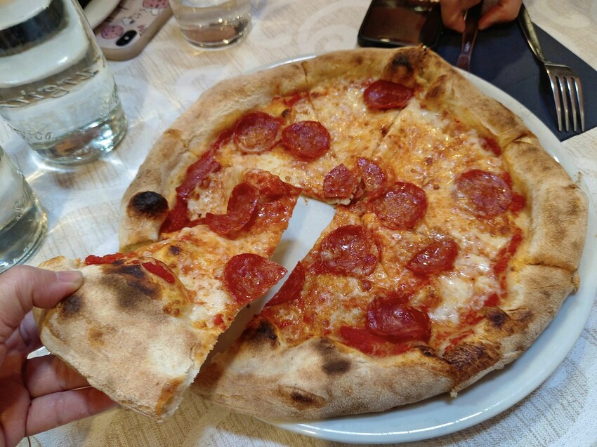 但在以披薩為主食的義大利,人家的披薩真的就是這麼簡單,倒是這家San Matteo Church Ristorante Pizzeria的餅皮相當好吃,外厚內薄,只有烤得略焦的外緣是厚的,據說正宗的義式窯烤披薩就是邊緣會烤出豹紋的焦黑狀,中間都是薄皮的披薩,吃起來有嚼勁又酥脆,害我連餅皮都吃光光