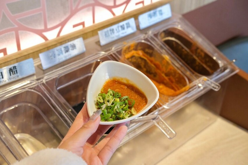 ▼【羊鮮森】提供多款醬料可自行搭配,包含蔥、蒜、辣椒、招牌豆瓣醬、特調醬油,還有紅茶都是可以免費續飲。