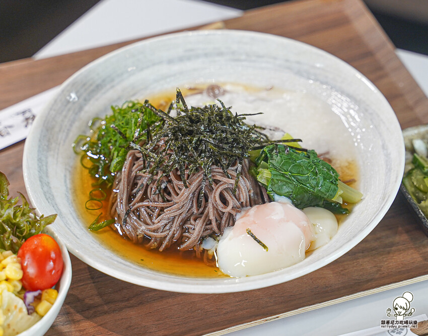 蕎麥麵份量蠻多的,撒上海苔、季節性蔬菜、蔥花、溫泉蛋