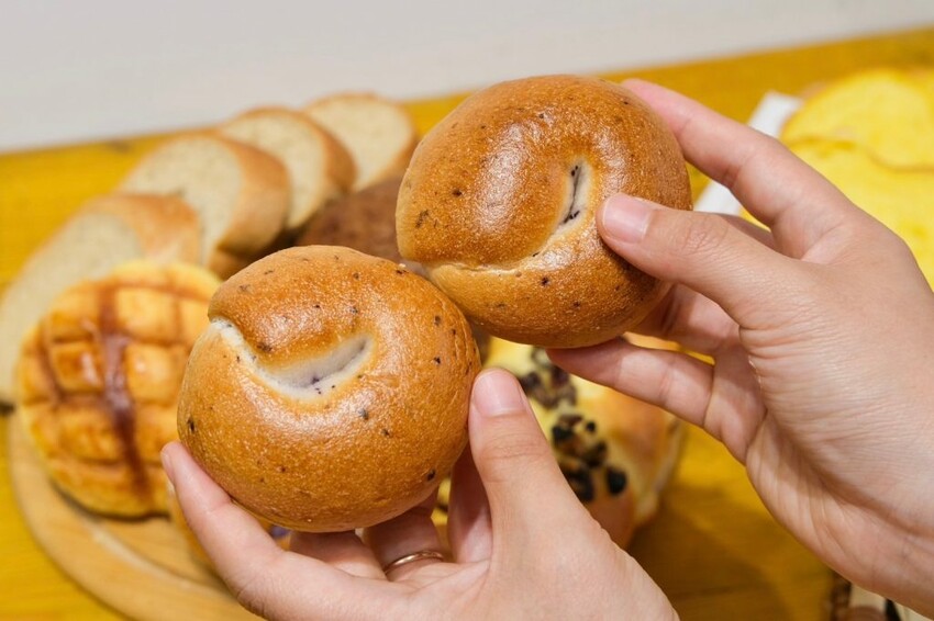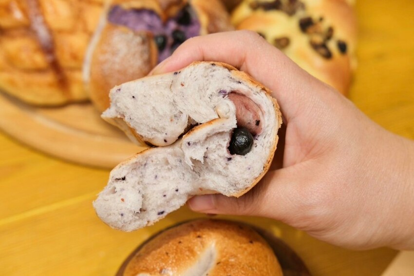 ▼小巧可愛的藍莓貝果共有兩入,一剝開就能看到完整藍莓果肉,嚼勁中有著迷人麵粉香,不知不覺就讓人吃光光。