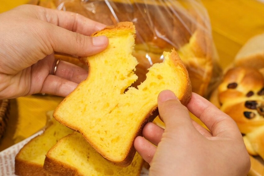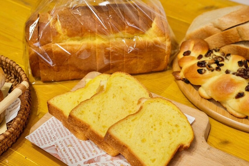 ▼營養滿分的南瓜吐司,使用南瓜本人真材實料製作,外表染上天然的南瓜顏色,吃起來有著淡淡甜香,柔香又彈的質地,用手剝來吃格外讓人享受,可以拉出一絲絲的口感!