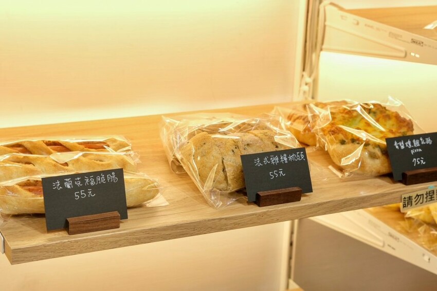 ▼走進【塔可手作烘焙】濃濃麵包香撲鼻而來,誘人的麵包們整齊擺放標示在櫃上,每一個都有以塑膠袋乾淨包裝,想吃什麼通通自己夾再結帳,生意很好沒多久就被迅速掃光!
