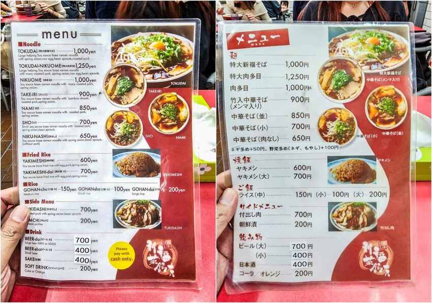新福菜館本店的餐點價格在京都拉麵店中算很便宜,建議大家可以跟著在地人點新福拉麵加一份炒飯,而且連女生都是這樣點!份量超多一樣照樣吃完,如果看不懂日文也有提供英文的菜單