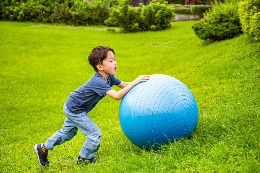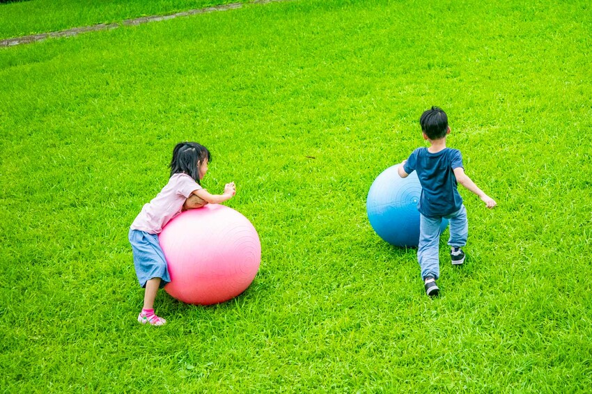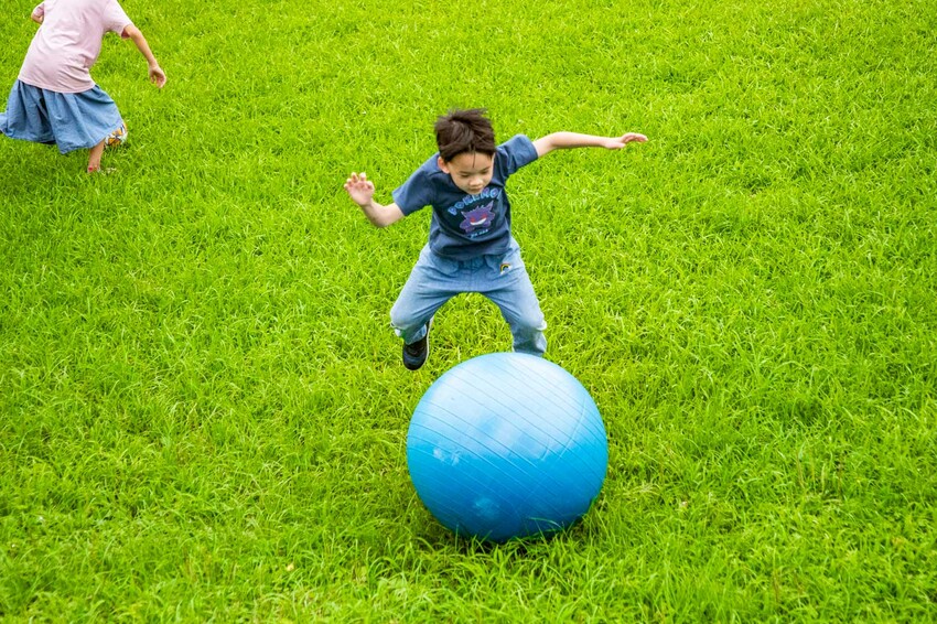戶外還有一大片草皮可以讓小朋友奔跑跟踢足球,小朋友們看見有大球可以滾立刻跑下去玩個痛快,這也是免費提供給遊客使用的唷,要是當天氣候不佳就不會提供大球了,大人可以邊喝咖啡邊看小朋友玩球