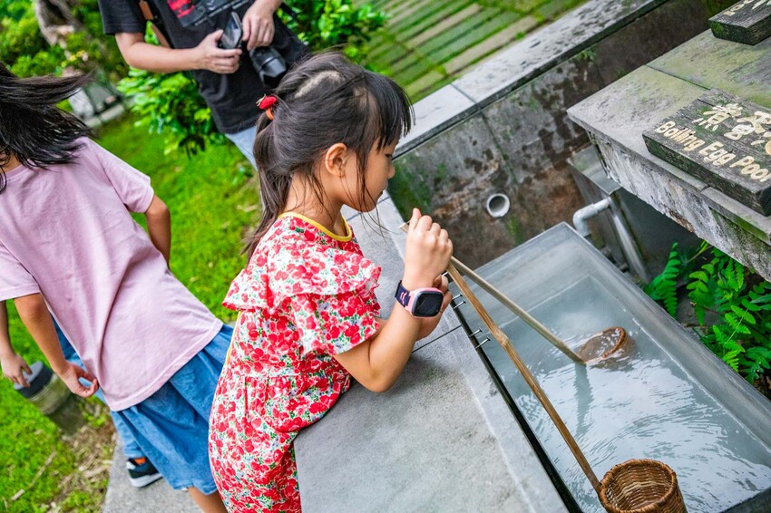 第二個特殊服務就是可以煮溫泉蛋!溫泉煮蛋開放時間為早上1030-1200、下午1630-1800兩個時段,想要體驗溫泉煮蛋的話記得要在這兩個時間內來訪,煮蛋體驗一次是每人50元有兩顆蛋,竹簍租借是免費的,溫泉煮蛋的地點就在天籟星巴克的咖啡廳正前方,走過去不用20秒就可以煮了