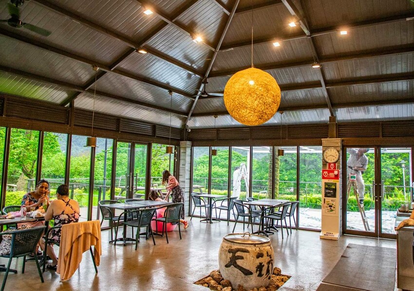 天籟星巴克咖啡廳擁有一個相當愜意的用餐環境,四周綠意盎然,旁邊還設有戶外大眾風呂,想要泡湯的朋友,不妨購買一張溫泉券來享受天籟溫泉,這裡的氛圍一步入咖啡廳就讓人有種渡假的感覺,非常棒。咖啡廳內部空間明亮且寬敞,由於客人中有穿泳裝的,因此座椅選用了藤椅,比較不會潮濕