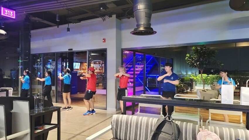 小涼正準備趁著夜晚球洞的繽紛再來打一場,卻突然的超嗨音樂響起,教練、服務人員們瞬間宛如潘老師上身,帶動跳起歡樂的舞來! 我們也當然不能輸的跟著跳起來,別看小涼肉肉的,人家也是靈活的胖子呢XD