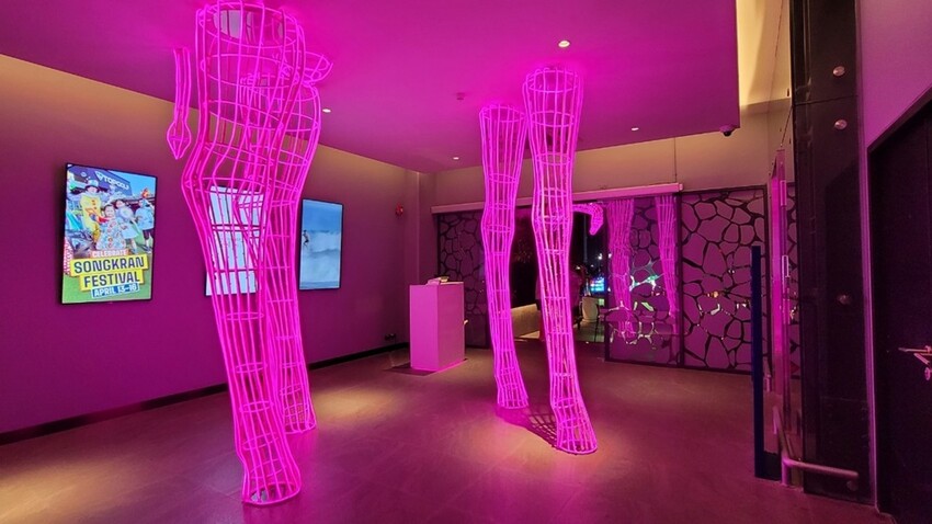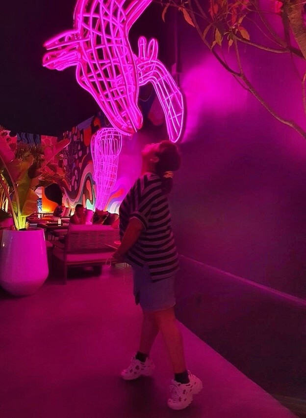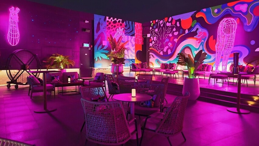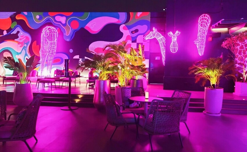 整個頂樓都是室外的酒吧空間,且環境都是小涼最愛的粉紫色系為主,這氛圍讓我再度戀愛了!!現場的座位也不少,加上以可愛的長頸鹿霓虹燈飾、綠意植栽、抽象的牆面更是讓人拍不停。