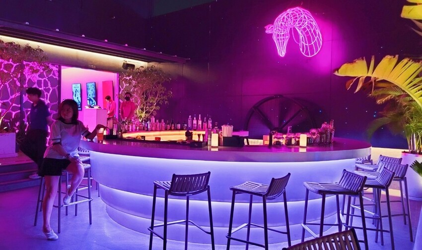 酒吧櫃檯會不定時的變換燈光顏色、加上高腳椅的座位,這區也是許多網美會拍照打卡的一個區域唷!
