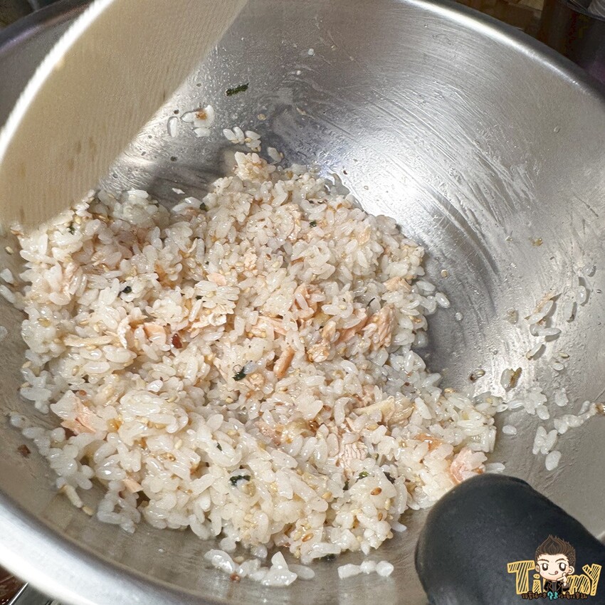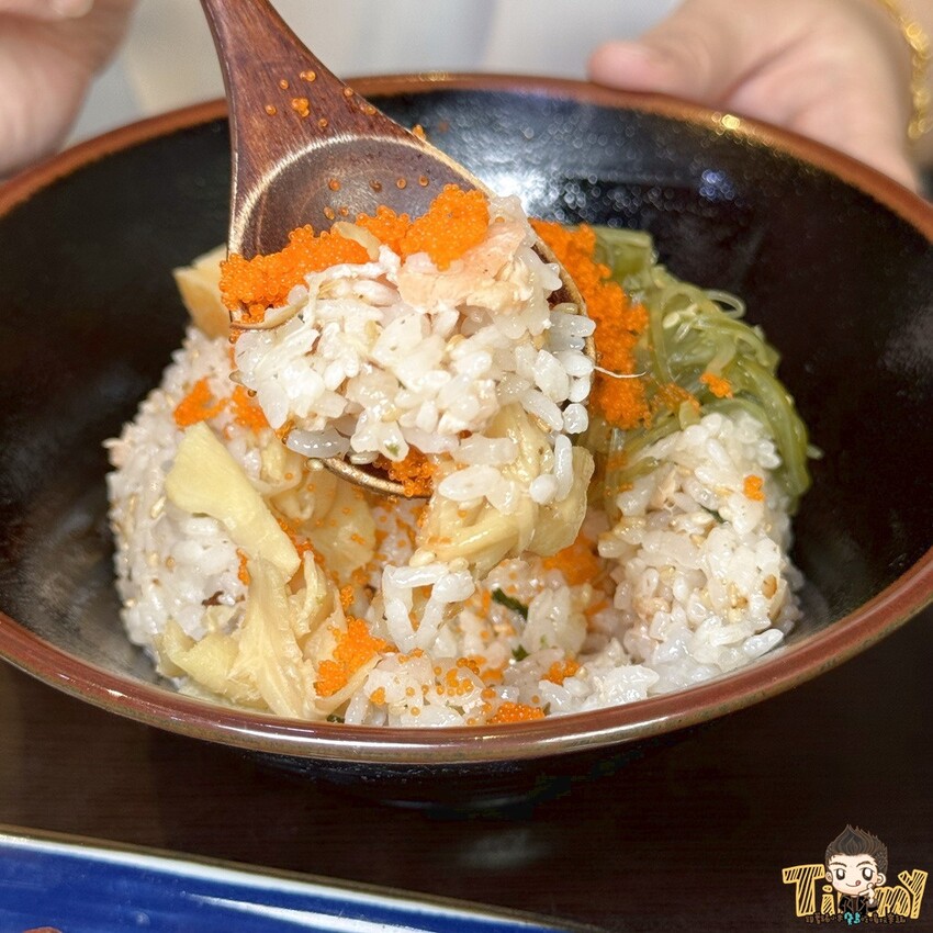 燒烤過的挪威鮭魚跟米飯、魚鬆、橄欖油及特製醬汁拌勻,再加上蝦卵、小菜及玉子燒,讓人一口接一口吃不停