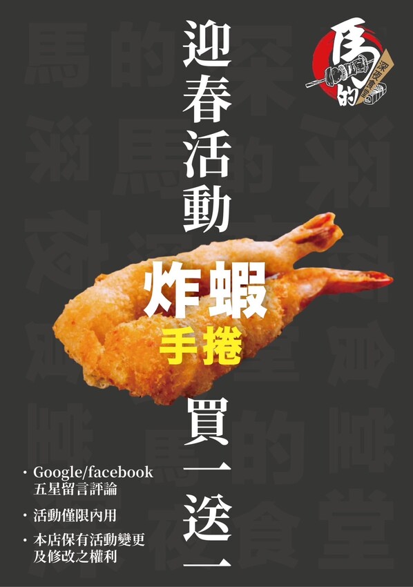 最新優惠活動:即日起至6月底Google/facebook五星留言評論,即享炸蝦手捲買一送一 (限內用)!