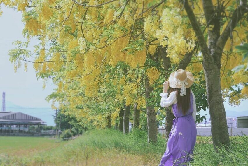 說到台南白河,很多人可能知道這裡在初夏會舉辦蓮花季。而同樣在這個時期盛開的還有這篇文章的主角阿勃勒,在白河同樣也有幾個景點可以觀賞,其中之一就是阿勃勒大道,又名蓮潭詔安厝,在台89縣道上種植約400公尺的阿勃勒樹。沿途可以欣賞阿勃勒黃金雨、蓮花和稻田,感受滿滿的鄉間風情!