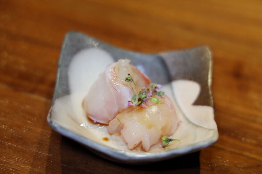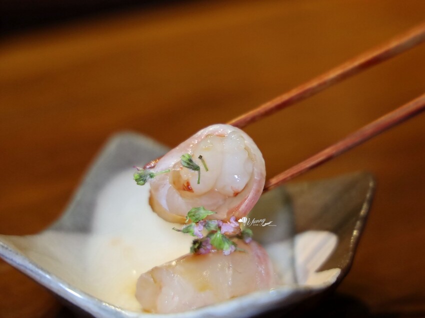 濱鯛是有著豔紅色外表的魚種,利用魚肉內捲上甜蝦,飾以清新優雅的紫蘇花穗。濱鯛肉質細膩口感極佳,吃來非常鮮美。搭上甜蝦的的脆甜,還有特別的紫蘇香氣,也令尾韻的香氣更加地迷人。 。