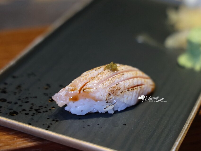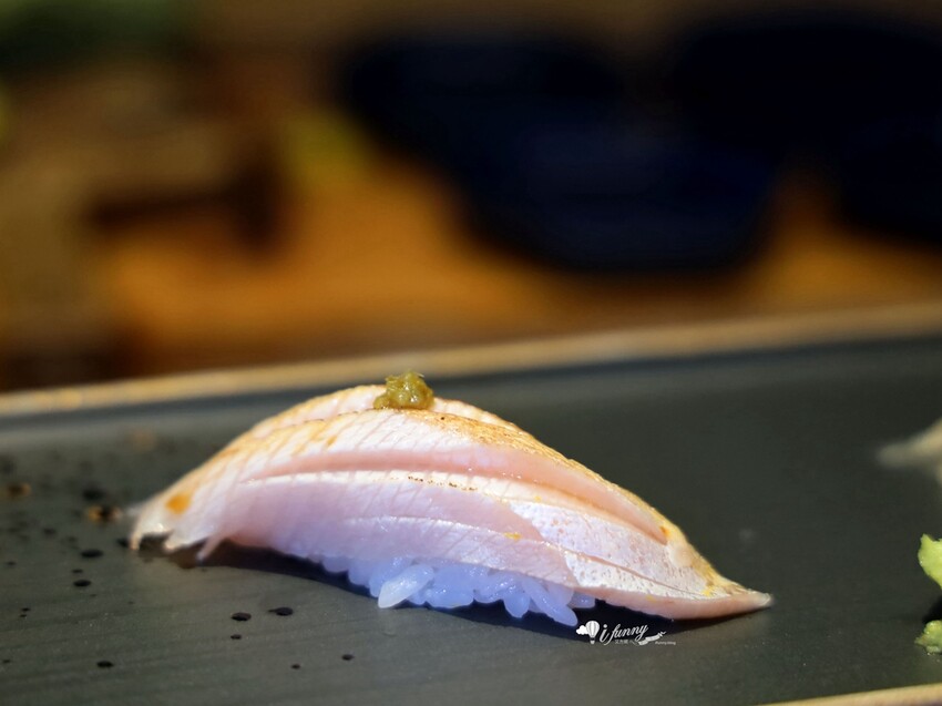 鰤魚肚油脂豐潤,經由炙燒提升了香氣,其上飾以柚子胡椒增味。入口後魚肚軟嫩鮮美,醋飯與魚脂完美的融合,柚子胡椒微刺激,吃來相當地爽口!