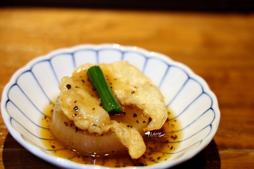 採用養殖的魚翅以天婦羅的方式炸成半月型,底層襯的是滷到入味的白羅蔔,其上飾以水蓮。算是第一次吃到炸的魚翅,天婦羅麵衣很酥脆一點都不顯油。經由醬汁的提點,令人回味無窮!