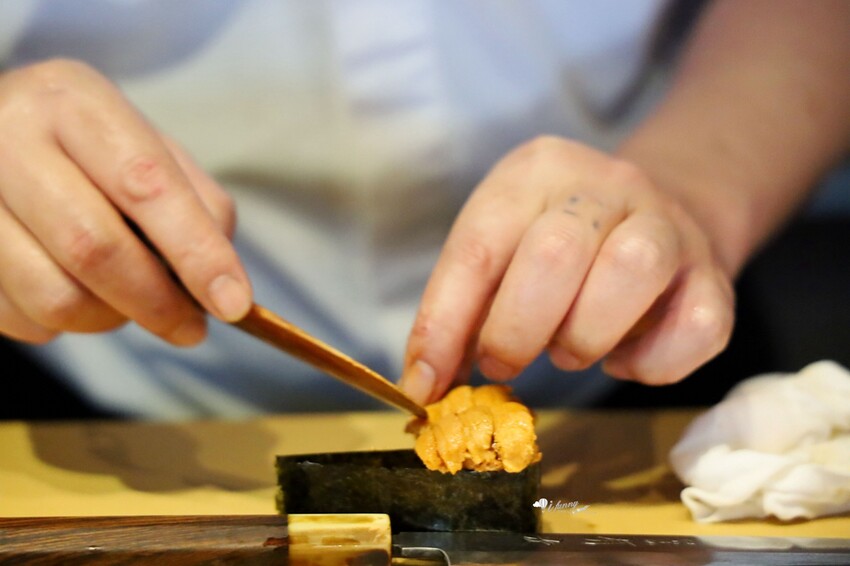 烤得脆香的海苔片包著醋飯,再不手軟地堆疊上海膽。