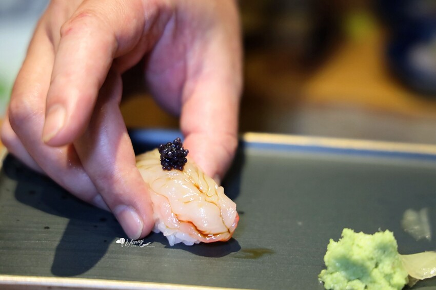 在日料的鮮蝦中,牡丹蝦是個人的偏愛。肥美的蝦身閃耀著晶瑩剔透,搭上奢華感的魚子醬。滿口盡是香甜軟滑的鮮美,蝦的甜度藉由魚子醬的鹹香更加地明顯,新鮮的蝦肉及嗶波跳躍的魚子醬帶來口腔的歡愉感。