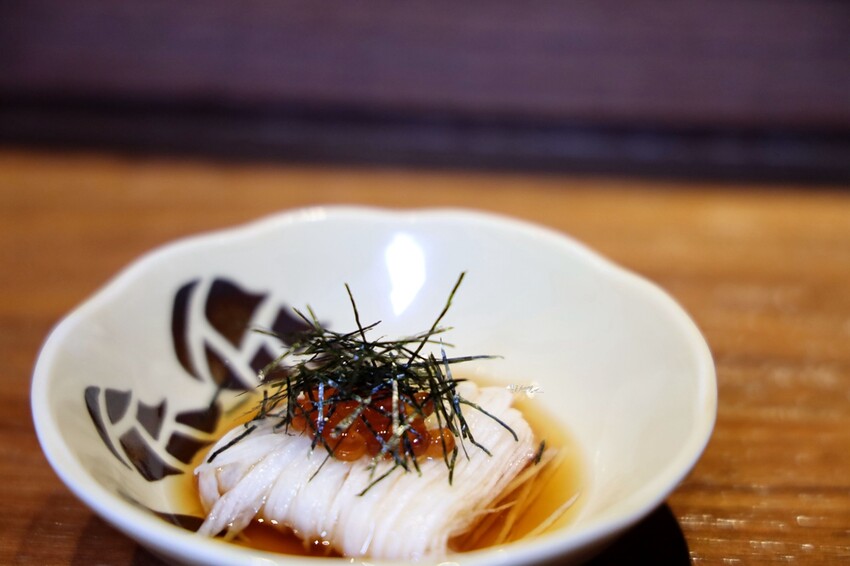 刀法俐落將山藥切成細絲如麵線,簡單飾鮭魚卵、海苔絲,加上微酸的醬汁,吃來相當清爽開胃。