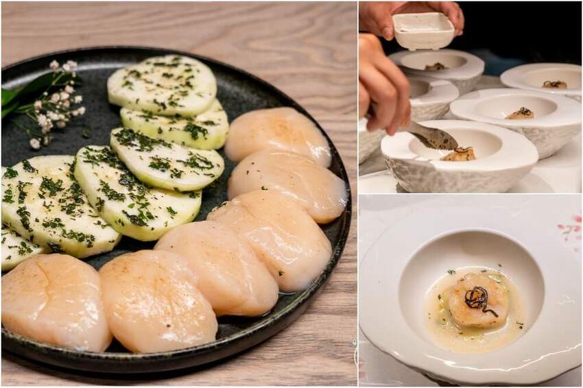 干貝烤好後,放入盤中,下方是清甜的絲瓜,佐上的是九層塔末,一口咬下是干貝的鮮,迸發的滋味則是極致的清甜,這組合有夠好吃。