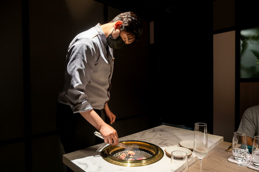 而侍老井包廂的侍肉師,在用餐期間會全程為你服務,不僅涵蓋代烤,也一邊介紹食材的不同,像是肉質、口感以及部位特色。
