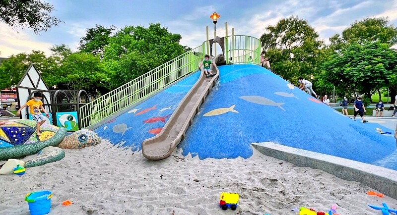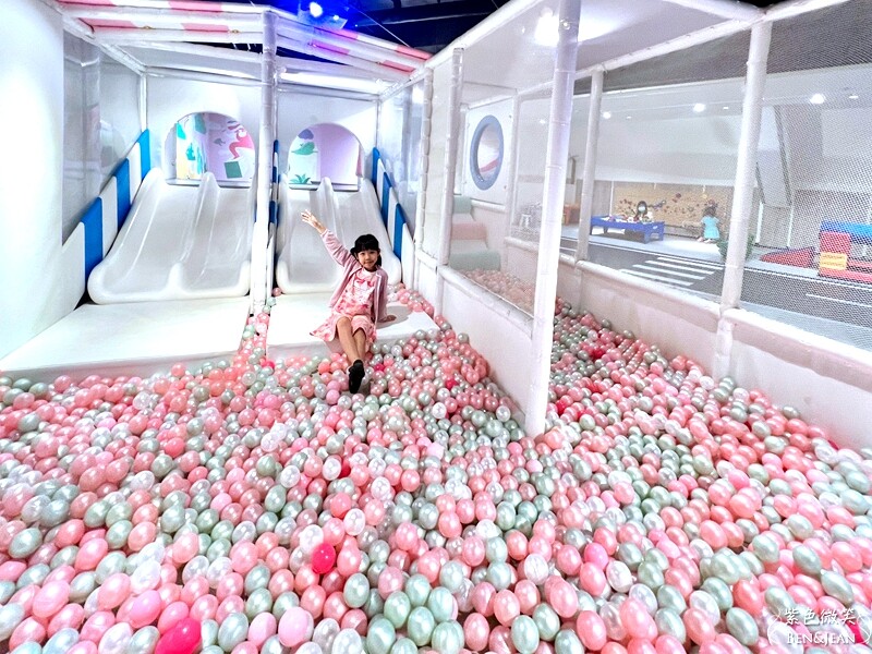 粉紅色的球池,還有溜滑梯呢,小孩最愛。而且加上了互動螢幕,可以丟球闖關非常好玩