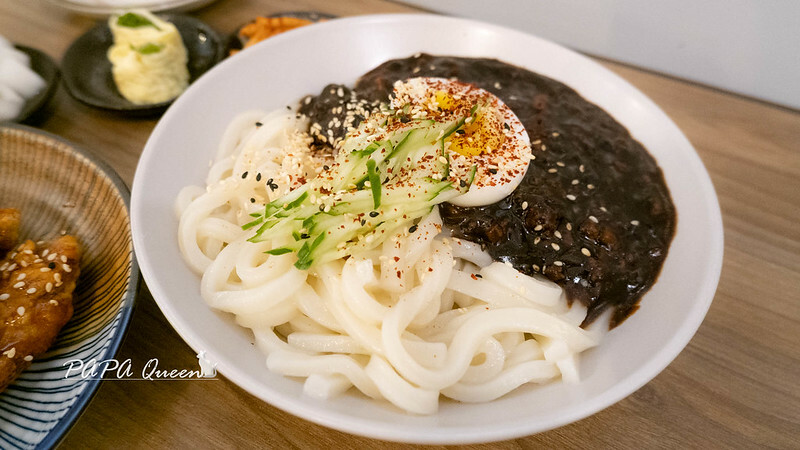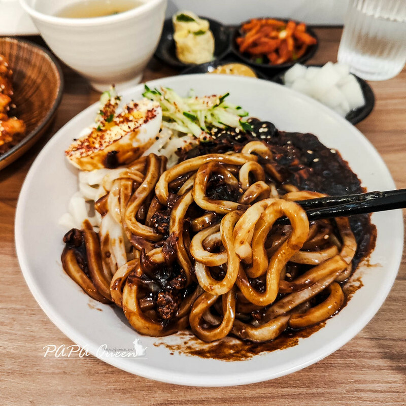 這裡韓式榨醬麵帶著肉燥與蔬菜的香氣,炸醬醬汁非常的濃稠帶著深咖啡的色澤,滿滿的肉末在其中為了不浪費這些醬汁絕對要認真的攪拌再攪拌讓烏龍麵沾上滿滿的醬汁才算對得起醬汁,搭配清爽小黃瓜絲與半熟蛋 就這樣。