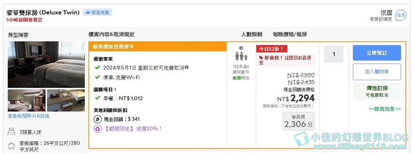 如果我們使用訂房網訂房,選擇5/15(週三)入住,雙人房的價格是2294元不含早餐。再加上兩個人的高鐵來回費用是5960元,所以總共是8284元。(以上費用為兩個人)