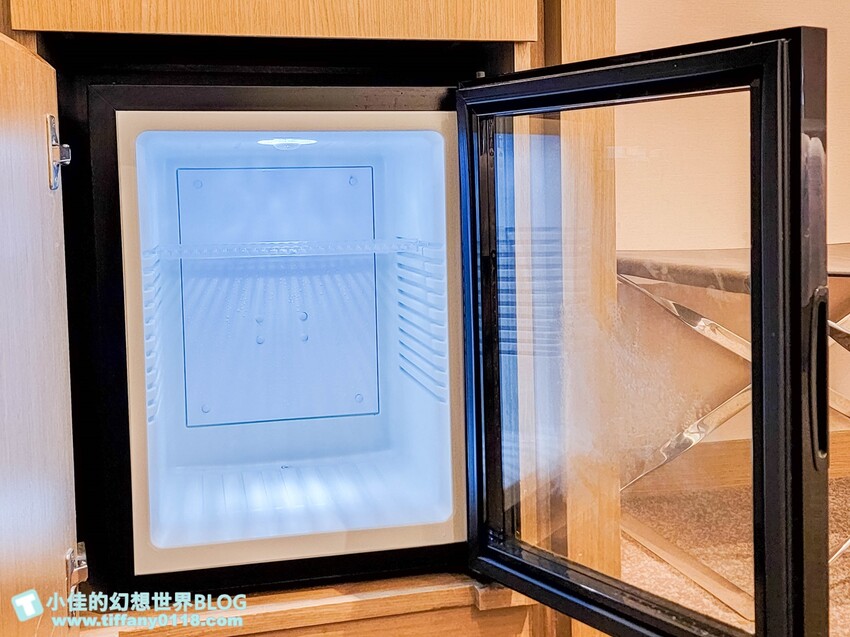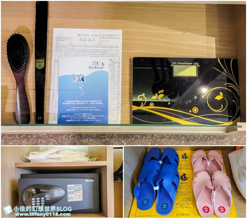 Mini吧旁邊的玻璃拉門拉開是衣櫃,裡面有衣架、電子保險箱、浴衣、室內拖鞋、體重機、鞋拔、鞋刷。