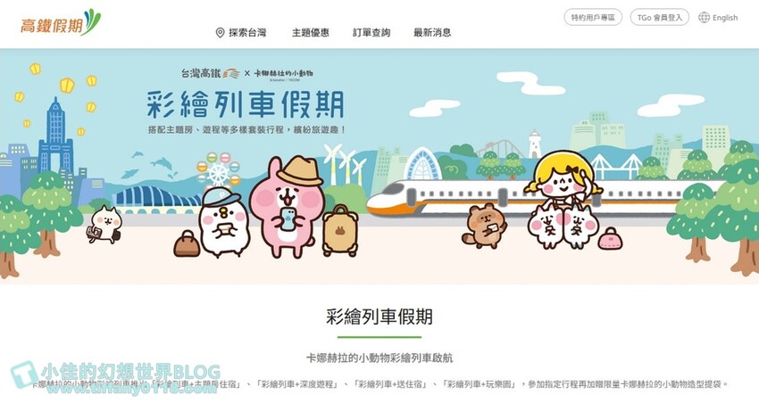 卡娜赫拉的小動物彩繪列車推出「彩繪列車+主題房住宿」、「彩繪列車+深度遊程」、「彩繪列車+送住宿」、「彩繪列車+玩樂園」,參加指定行程再加贈限量卡娜赫拉的小動物造型提袋。這次我選擇參加高鐵假期跟「卡娜赫拉彩繪列車+主題房住宿」活動,入住高雄翰品酒店兩天一夜。產品內容包含:高鐵標準車廂對號座來回車票(可使用TGo會員點數折抵)、自選房型住宿一晚(有雙人客房跟四人家庭房可以選)。*透過折扣碼(代碼輸入20240414、辨識碼輸入supertaste),單筆訂單折$200/人,再加碼手機掛繩乙份。**紀念商品可於高鐵站內超商與自動販賣機購買*