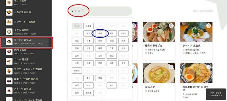 進入到「tabelog百名店」的app後,你會發現左側的料理選項條,一共有29個之多,在選項中找到自己有興趣的點擊,這邊附帶說明的是有些熱門、餐廳數較多的選項會細分成東日本及西日本,甚至如拉麵還有單獨拉出東京、大阪的,福島屬東日本所以要點擊拉麵選項中的「east」。點擊(すべて)之後可以發現「福島」的字是比較顏色(比較淺表示該縣市沒有入選的店家),