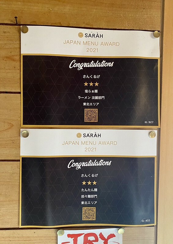網路上查了一下資料,さんくるげ開業於2019年4月,隨即在2020年後連四年入選tabelog的二星、三星拉麵,2022年開始也入選東日本百大拉麵,據說最高時tabelog的分數曾到達4分的神境界,如果你有在使用tabelog就知道除了高端的日料、法餐,要得到4星有多難。於是,我又好奇了,這麼鄉下地方的拉麵店為什麼會有這麼多人來評分(tabelog的評分標準是越多人評分越高,所以鄉下基本上很少會有高分)。得到的答案是,店主人是東京某星級米其林的師傅,而這家拉麵店的前身是他父母經營的壽司店,所以獎牌的後方還有當年留下的招牌「鮨」。