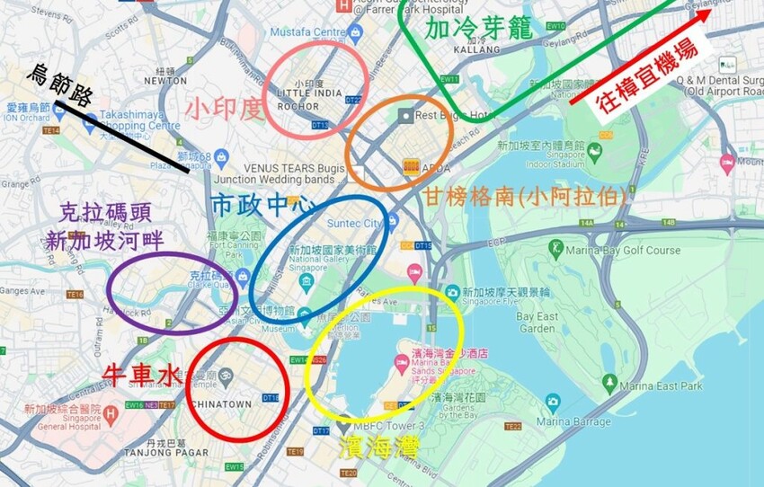 大致可以用上圖的區域劃分,小印度、甘榜格南、市政中心、克拉碼頭、牛車水、濱海灣這六區 1 天安排走兩區,用 3 天玩完市區,再留 1 天去聖淘沙