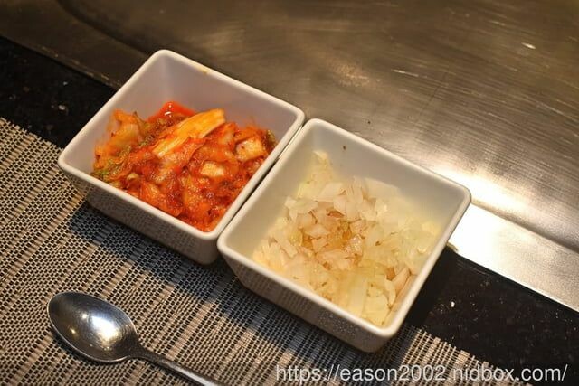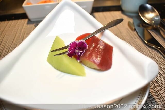 餐前提供佐餐茶,使用礁溪溫泉米(黑糯米/糙米/紅糯米)製成的三寶米茶,淡淡的米香;以及佐餐小菜,獨家特製泡菜與生洋蔥佐和風醬,開胃清爽。
