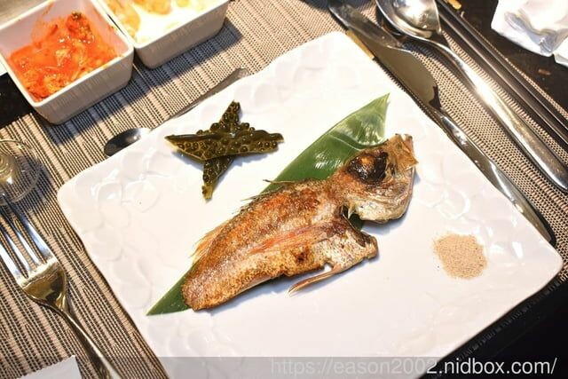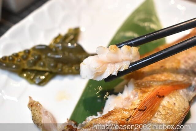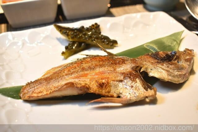 香煎野生紅喉魚的口感鮮嫩細緻,些微的細小魚刺,不算多,輕沾芥末胡椒鹽,增添風味,也可以搭配自家醃漬的紫蘇梅山苦瓜。