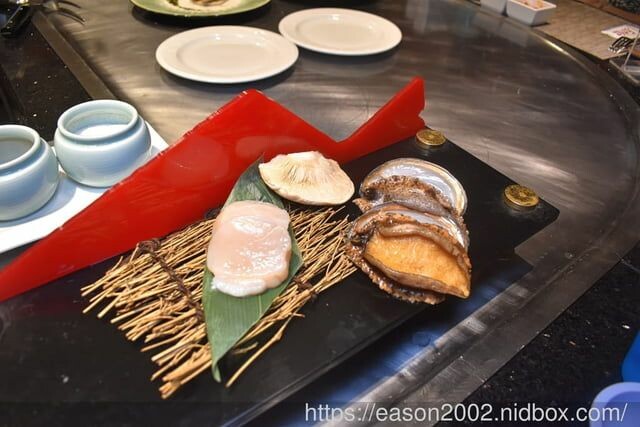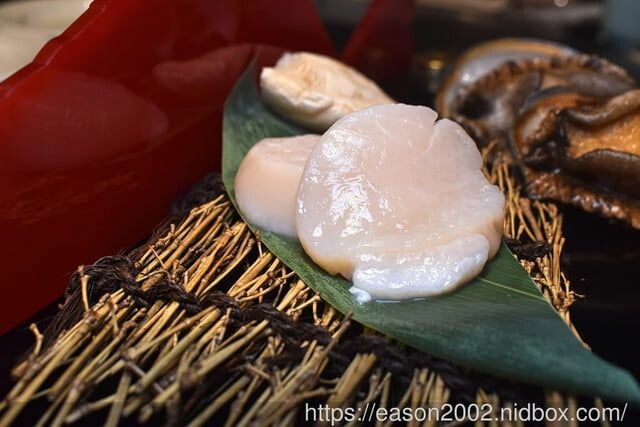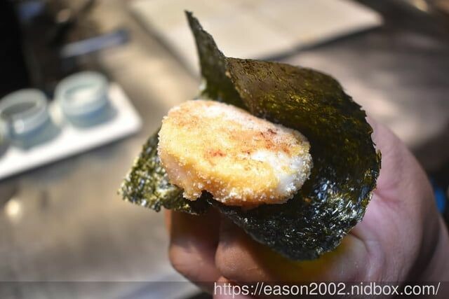 50元硬幣兩倍大的北海道干貝,裹上仙貝粉後,在鐵板上香煎滋滋作響,外層表面恰恰,旺旺仙貝加上林屋海苔,紮實飽滿的口感,與新鮮海味正衝擊著味蕾。