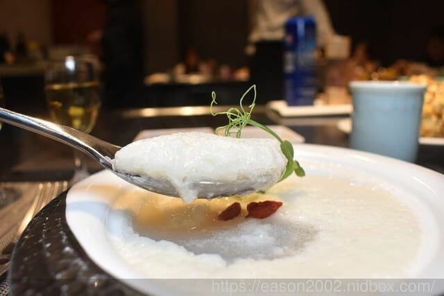將山藥打成綿密細緻的泡狀,喝起來帶點些微的口感,底層可以吃到干貝絲,山產與海味微妙的組合。